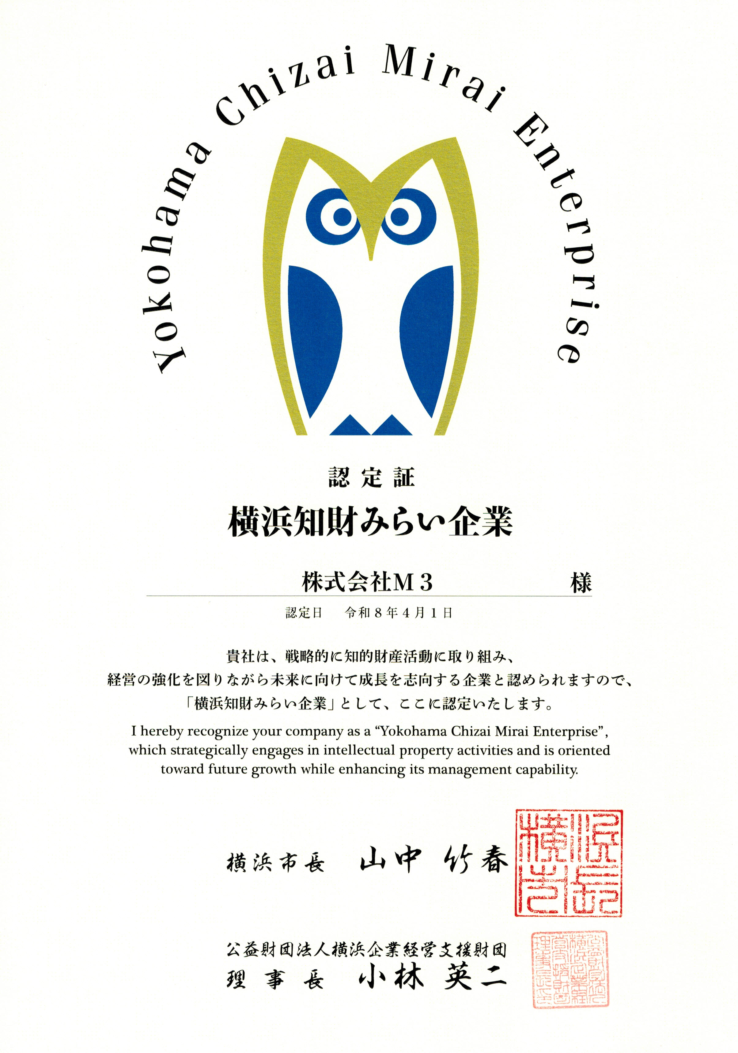 - 株式会社M3は横浜市より「横浜知財みらい企業」として認定されました。